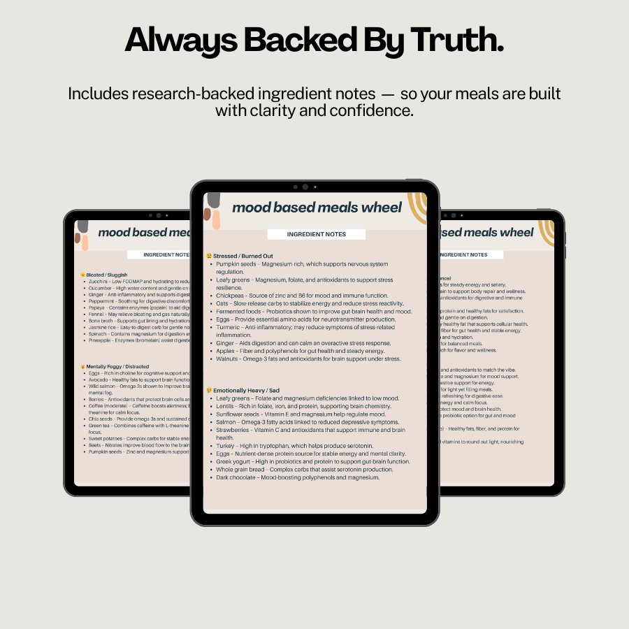 Whether you're feeling low energy, anxious, overwhelmed, or simply want to nourish yourself more intentionally, this visual guide makes it easy to build meals that match your body’s needs — with research to back every ingredient.